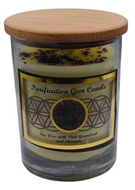 Purification gemstone candle sprinkled with the shungite chips.These are made with soy wax with the scent of pink grapefruit.Glass jar with wooden cover, measuring 4 3/4" tall and 3" wide.