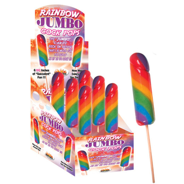 Rainbow Jumbo Cock Pops (Display)Take you tastes over the erotic rainbow with these multi-color Cock Pops. Sure to make any party come alive, with there bright neon color stripes and great fruity flavor taste!Includes 6 pops.
