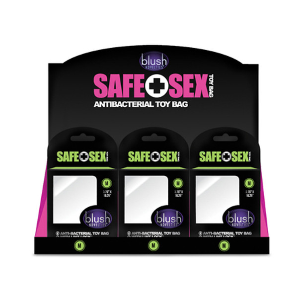 Keep your best friend safe with The Safe Sex lint free and antibacterial toy bags. The antimicrobial features of The Safe Sex Toy Bags utilizes the power of silver to bring long-lasting antibacterial properties. This unique antimicrobial product contains ultra-fine silver crystals that release silver ions at a controlled rate only when the conditions for bacterial growth exist. The antimicrobial properties are durable to multiple washes, lasting the useful life of the toy bag. The special material is lint free so your vibe does not get linty. The Safe Toy Bag is satiny smooth and comes with convenient drawstrings so you can cinch your bag shut. Medium Safe Sex Toy Counter Display Includes: 24 pieces (length 10.25" x width 3") - holds up to 9 inch toys.