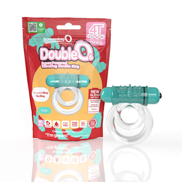 The DoubleO 6 vibrating ring features two specially positioned rings for an extra-secure fit - simply stretch one around the shaft and the other around the testicles. Featuring a powerful 4T motor creating treble style tickle and tease vibrations, new 4LR44 longer lasting batteries, and raised pleasure ticklers, the Screaming O 4T DoubleO 6 gives couples mutual super-powered pleasure right where it counts!In addition to promoting sexual health and wellbeing, Screaming O wants to put your mind at ease knowing that the Screaming O 4T DoubleO 6 was manufactured using materials and processes that are both ethical and sustainable. With compostable, eco-friendly packaging and more reliable, longer lasting batteries, we believe in doing our part to leave this planet better off than we found it.Features4T motor with tickle and tease, treble vibrationsDouble rings for a snug fit - 1 for shaft & 1 for testiclesSuper-powered bullet motor for mutual satisfactionMade of lab-tested, body-safe SEBS and ABS materialsNew reliable and long-lasting 4LR44 batteryWaterproof30+ minutes of battery life5 speeds plus 1 pulse pattern