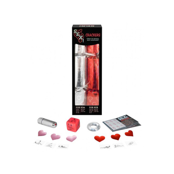 Share sexy surprises with your lover. Includes one "cracker" for him and one for her. Pull on both ends to open a surprise collection of sex toys, games, and position cards. The "For Him" Cracker contains: a cock ring, 3 scratch tickets with winning combinations of sex positions to act out, 3 sex position cards, and heart-shaped confetti. The "For Her" Cracker contains: a mini-bullet vibe, a die with 6 unique sex positions, 3 sex position cards, and heart-shaped confetti. @vday2020-13 @vday2020-22
