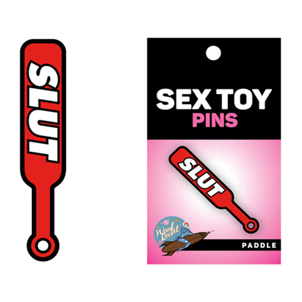 This fun soft enamel lapel pin by Wood Rocket is the perfect accessory. Wear your sex product pride! This paddle Sex Toy Pin is red with white text and looks just like a fetish BDSM paddle that says Slut but it's tiny! Stick it on your hat or clothes or backpack or bag or purse it or give it as a gift! Please don't stick it on your butt. It is sharp!