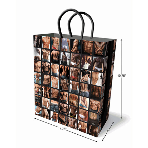 Delicious abs and asses were the inspiration behind this mesmerizing gift bag. Gift-giving never looked so exciting. Made with high quality materials this medium size gift bag is constructed with heavy card stock and sturdy woven handles. A must for novelty, gift, liquor and adult stores this bag is playful, fun and sexy.