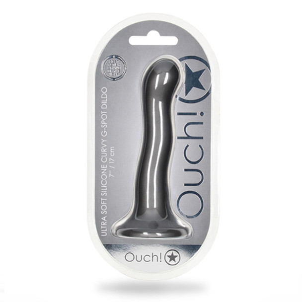 The 7" / 17 cm Ultra-Soft Curvy G-spot Dildo made of liquid silicone, with its strong suction cup and beautiful metallic color, is in a class of its own. The liquid silicone gives an extra soft and flexible feel vs traditional silicone. Whether you are going solo, with your partner or even using it with a strap-on, explore new pleasures with these beautiful Ouch! Premium silicone and liquid silicone dildos. Pairs perfectly with the Ouch Strap-on Panties.Dimensions package: 5.12" x 3.54" x 10.63"Weight package: 8.18 ozProduct dimensions: 2.76" x 2.76" x 7.09"Product weight: 6.1 ozProduct diameter: 1.46"Insertable length: 6.69"Waterproof: YesSplashproof: YesPhthalate free: YesMaterials: Liquid Silicone