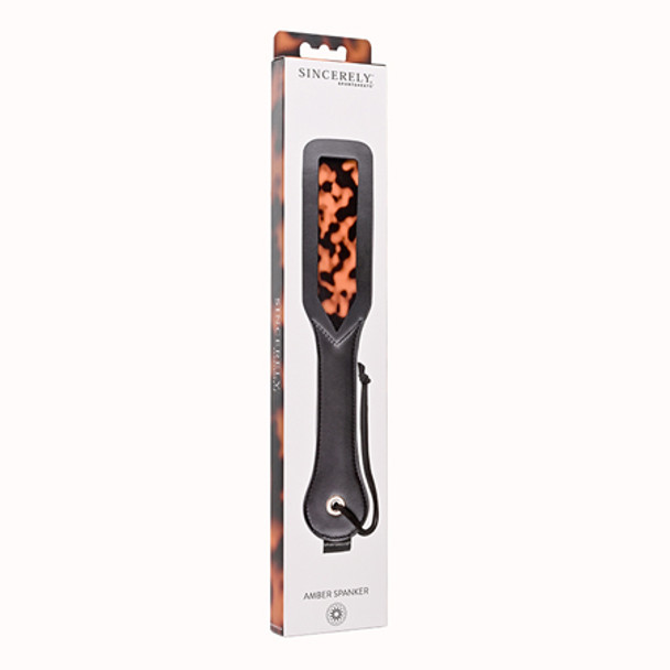 Drown in the delicious delights of impact play with the Amber Spanker, fashioned with gold and tortoiseshell inspired layers for a lip-biting, toe-curling experience. Handle includes a spring steel center for a rigid and durable grip.12" PU spanker with imitation tortoise PVC cut out and light gold rivet holding 6.6" rawhide leashGolden grommet and leash for convenient storageMultiple layers for added intensityConstructed with malleable yet durable materialMaterials: 50% PU, 35% Phthalate free PVC, 10% Microfiber, 5% IronLifetime Warranty