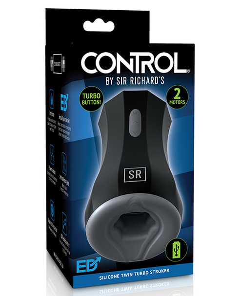 Crafted with the power to influence, CONTROL offers technology to enhance masturbation and elevate intimate experiences. The Silicone Twin Turbo Stroker was designed for ultimate solo stimulation by snugly surrounding the penis with pleasing warmth and powerful vibrations from dual bullets strategically placed at both the top and bottom. Turbo Button Provides an extra burst of power to take your orgasm over the top! 10 vibration modes Erectile Dysfunction Aid :Regular masturbation strengthens pelvic floor muscles, helping to prevent erectile dysfunction (ED) in men. Edging, the practice of purposely delaying orgasm, can build sexual stamina and can help with ED by encouraging healthy blood flow to the penis. Waterproof. Warming USB Rechargeable : 1+ Hour Continuous Run Time per Charge Length: 6.1" (15.5 cm) Width: 3.5" (8.9 cm)