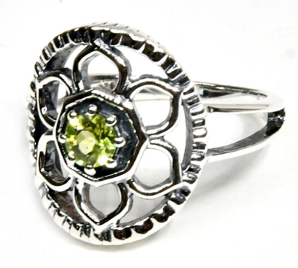 Allow the combination of a lotus flower and peridot to help offer you strength while you keep rising through any situation.Beautifully handcrafted sterling silver ring with piece of peridot in the center.Sterling silver size7