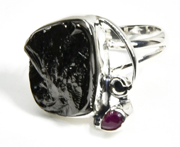 A uniquely handcrafted ring set with a shungite piece and a small ruby gemstone.Sterling silver band charged with a couple of power house energy crystals.Size8