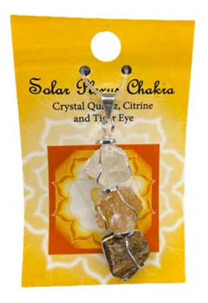 Align your chakras with this beautiful, natural stone, pendant.The solar plexus chakra regulates self-esteem.Made with quartz, citrine, and tiger eye.Length is approx.2"