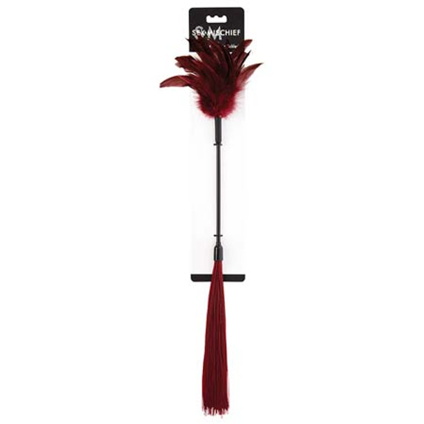 Tickle, tease and tempt their flesh towards desperate arousal. Caress every curve into complacency...then spank it into submission with this devious dual-action Enchanted Feather Tickler. Your lover will be begging for your touch as the delicate feathers and stinging silicone threads take them to the edge. The perfect balance of soft and striking, this implement of delight plays well with your favorite lingerie or a set of cuffs - and even comes complete with a guide of playful activities to tickle your partners fancy with. COLOR: RED@np2020-63