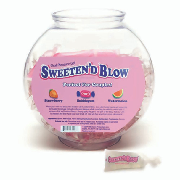 Make your next oral encounter sweeter with Sweeten'd Blow oral pleasure gel. Our product stimulates him while providing her with the sweet taste of sensuous fruit. Simply apply the gel to any part of the body that you wish to sweeten and then have your lover lick it off. Oral Sex has never been more pleasurable!Display contains 66, 10ml tubes in Strawberry, Watermelon and Bubblegum flavors. Made in the USA.