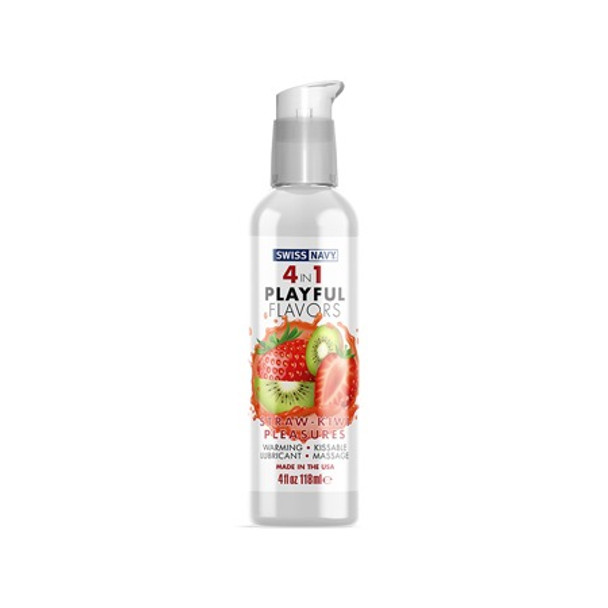 4 in 1 Playful Flavors promise playful pleasure in all its forms! Straw-Kiwi Pleasures delivers the sweet flavors and fresh scent of juicy strawberry and lush kiwi fruit to stimulate your senses-and your taste buds! Apply liberally to enjoy a flavorful strawberry and kiwi experience. Gently rub or blow on the liquid to release an alluring warmth. Or savor slippery goodness when added to a massage or used for lubrication. Straw-Kiwi Pleasures 4 in 1 Playful Flavors captivates and excites all of your senses!1 Warming Pleasure: Love Feels Warm. Warmth is comfortable, relaxing, and incredibly sensual. Adding the element of heat to your sexy encounters creates a naturally "hot" sensation-play experience. 2 Edible Fun: Love Tastes Good. Create delightful, kissable adventures in truly delicious ways. Engage more of your senses with a fun-loving edible experience. 3 Smooth Lubricant: Love Lasts. Sometimes you want the pleasure to last forever, right? This silky, sensual lubricant sustains lovemaking with a long-lasting formula. 4 Arousing Massage: Love Every Touch. Each caress and stroke excite your senses. Playfully inspire your massage-worthy moments with a fluid, effortless glide. 1+2+3+4 = Infinite Playful Love Possibilities! Playful Flavors is lube for your lifestyle. From frisky foreplay to surreal sex, 4 in 1 Playful Flavors makes it easy to explore ways to add more play to your love life. Ingredients: Glycerin, Deionized Water, Flavor.