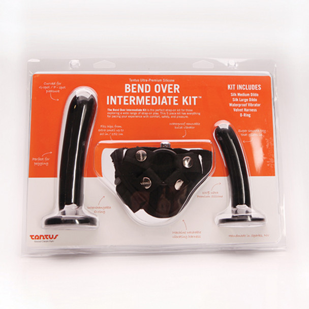 The Bend Over Intermediate Kit is the perfect way to continue exploring strap-on sex. This kit has two smooth 100% ultra-premium silicone dildos, the Medium and Large Silk, and comes with a vibrating velvet harness that is comfortable, adjustable (fits up to 60 hips), and machine washable. It also comes with an O-ring to accommodate multiple sized toys, as well as a One Touch Vibe that fits snugly into a pocket on the front of the harness for stimulation to both the strap-on wearer and their partner. Small Dildo measures 5.5" in total length, 5.25" in insertable length, 1.10" in width. Larger Dildo measures 7" total and 6.9" insertable. It is 1.5"at it's widest point (tip) and 1.25" further down the shaft.