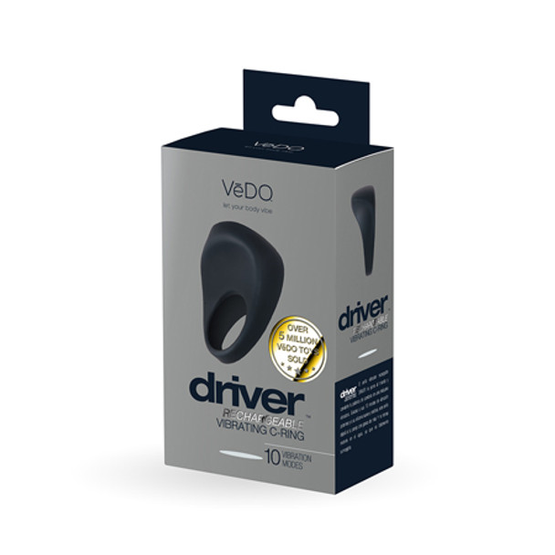 Driver Rechargeable Vibrating C-ring puts you in the driver's seat, making your hard stick a vibrating machine. Boasting 10 supercharged vibration modes and made of velvety smooth silicone, this c-ring will leave your partner wanting more. And don't be afraid to drive it into water - it's completely submersible.Features:Round edge for clitoral stimulationStretchy silicone to fit any girth10 Vibration modesSubmersibleTravel lock100% SiliconePhthalate- and Latex-FreeVelvety soft