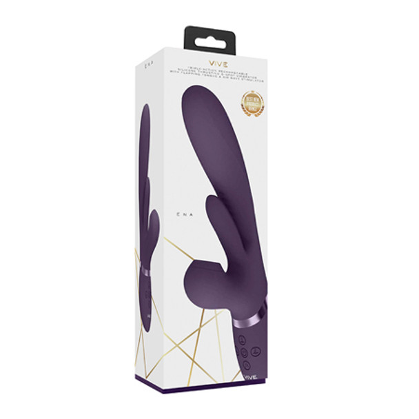 VIVE ENA is in a class of its own. With three 10-function new generation F1 motors and its advanced technologies (three motors can be independently controlled): one innovative 10-function NG F1 thrusting motor for your G-spot, one first of its kind 10-function NG F1 flapping shaft motor and one 10-function NG F1 motor airwave technology for clitoral stimulation, it's sure to bring you to maximum heights of pleasure in all your erogenous zones. You can setup your toy with up to 1,000 distinctive settings. Made from silky smooth medical-grade silicone (hypoallergenic), it is totally waterproof (IPX7), and extremely quiet at under 60dB. This means you can use it wherever your heart desires! It contains a USB magnetic rechargeable lithium-ion battery. When fully charged with its USB cable, it will provide 60 minutes of passionate playtime. Just plug, charge and play! When you're getting close to climax, just one-touch of the special function climax button will immediately bring all the motors to full power/speed and, more importantly, bring you to an earth-shattering orgasm. All VIVE vibrators have a full 1-year warranty to protect your investment.Dimensions package 12.4" x 4.25" x 3.07"Weight package 22.79 ozProduct dimensions 9.8" x 1.61" x 3.11"Product weight 9.84 ozProduct diameter 1.3"Insertable length 5.31"Quantity motors 3Speed modes 10Multi speed YesNoise level 60 dBRechargeable YesRechargeable time 120 minRecharged battery lifetime 60 minWaterproof YesSplashproof YesPhthalate free YesRotations per minute:Suction: 550 RPMTongue flapping: 12000 RPMThrusting: 10800 RPMMaterials Silicone, ABS