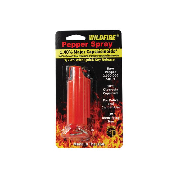 Wildfire 1/2 oz 1.4% MC pepper spray hard case and quick release keychain red. The WILDFIRE® PEPPER SPRAY is hot, hot, hot. The Major Capsaicinoids are the true heat measure, WildFire has the hottest on the market at 1.4% Major Capsaicinoids. In addition to causing an attacker pain, The WildFire 10% oleoresin capsicum formula swells the mucous membranes, which makes breathing difficult, and swells the veins in the eyes, causing the eyes to close. It's made from 2,000,000 SHU's of raw pepper and these effects can last up to 45 minutes and cause no permanent damage. Has a UV identifying dye to help aid in the identification of an attacker. Wildfire 1/2 oz. Pepper Spray has a range of 6-8 feet and comes with a hard case. Each unit provides 6-10 one-second bursts and comes with a quick key release keychain, and safety lock. 3 ½" x 1 ½"